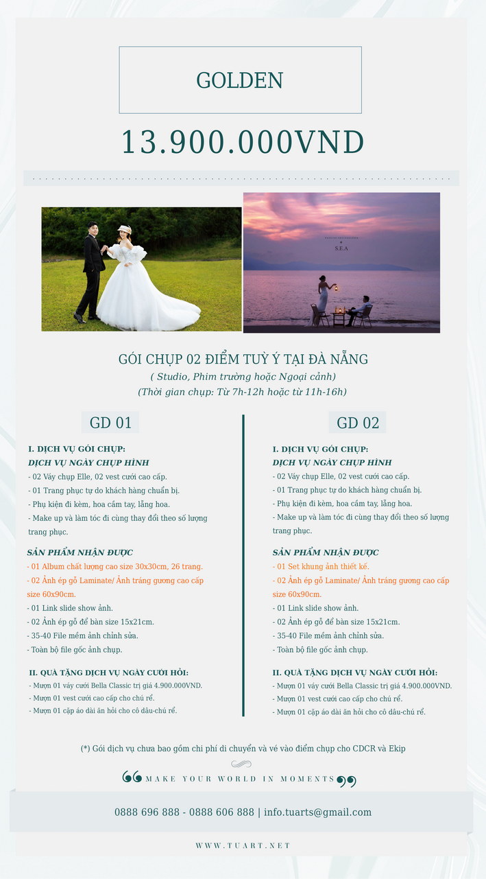 Với hơn 9 năm kinh nghiệm trong lĩnh vực cưới hỏi tại Việt Nam, TuArt Wedding tự hào sẽ mang đến cho các bạn những trải nghiệm hoàn hảo cùng đội ngũ chuyên nghiệp, sáng tạo, không ngừng thay đổi và dẫn đầu xu hướng hiện đại đã làm nên thương hiệu TuArt Wedding.