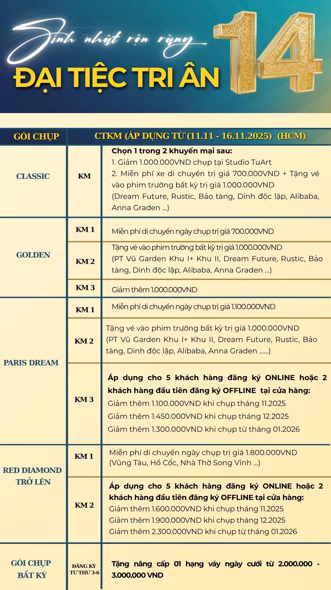 ƯU ĐÃI ĐẶC BIỆT khi khách hàng đăng ký gói chụp RED DIAMOND trở lên :